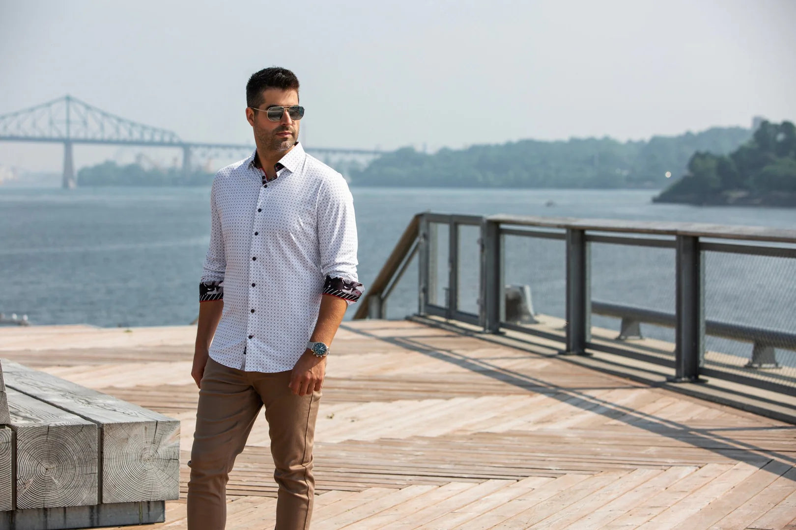 This is a collection of comfortable, performance stretch, fashionable dressy and casual shirts. Stand out from the crowd, thanks to Au Noirs cleaver use of contrasting patterns and sophisticated details. Comfortable with a high quality, performance stretch cotton fabric.