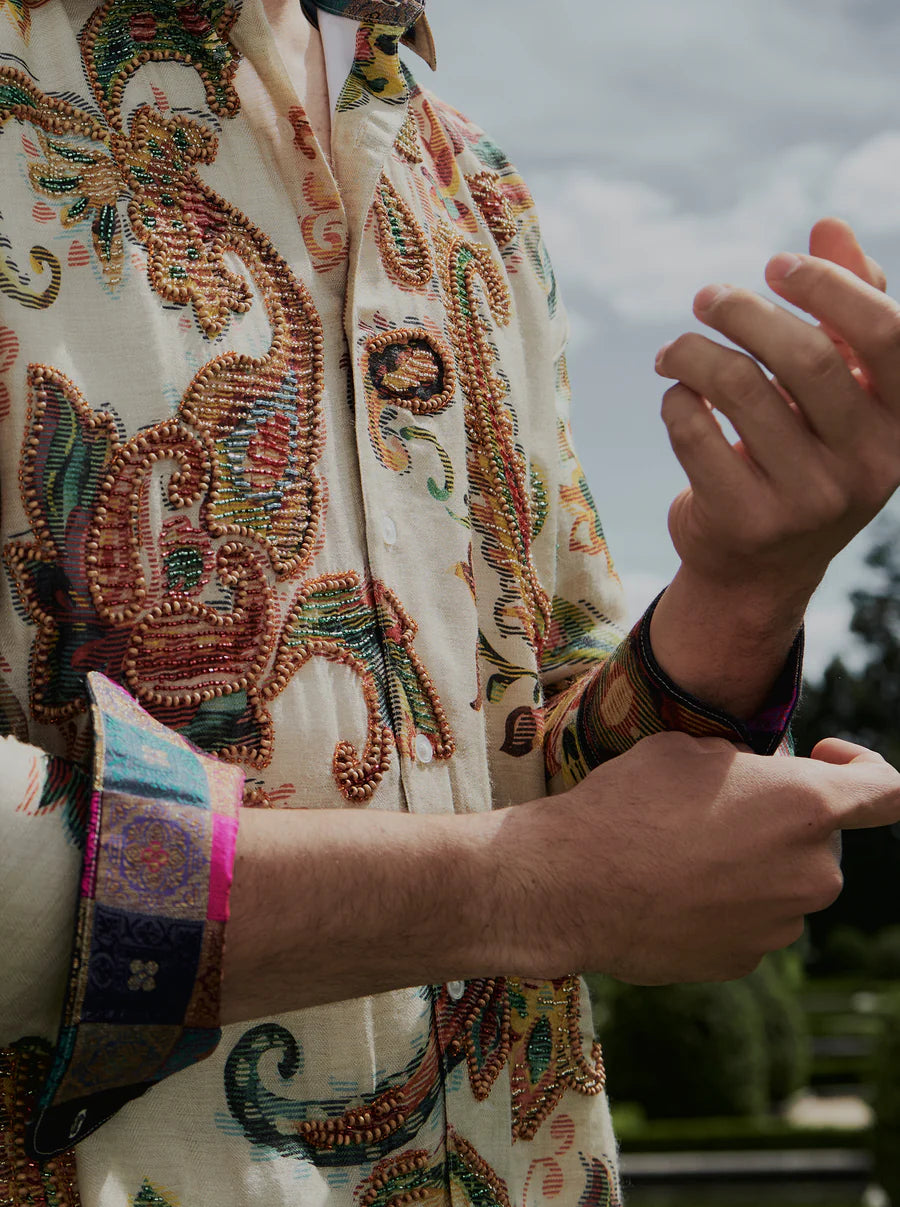 Meticulously hand-embellished beadwork traces the large paisley motif adorning the front and back, creating depth and dimension. The neutral palette ensures versatility while honoring its Turkish caftan inspiration. Silk brocade trim lines the interior, offering a secret touch of opulence at the collar and cuffs. Each stitch represents artisanal craftsmanship, resulting in a garment that brings timeless design sensibility.